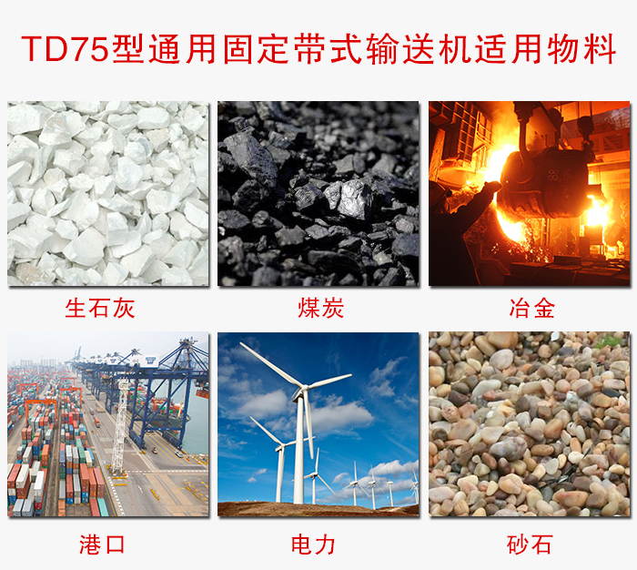 TD75通用固定带式输送机由于输送量大、结构简单、维护方便、成本低、通用性强等优点,而被广泛地应用在冶金、矿山、煤炭、港口、交通、水电、化工等部门进行装车、装船、转载或堆积各种常温状态的松散密度为500~2500kg/m3各种散状物料或成件物品。